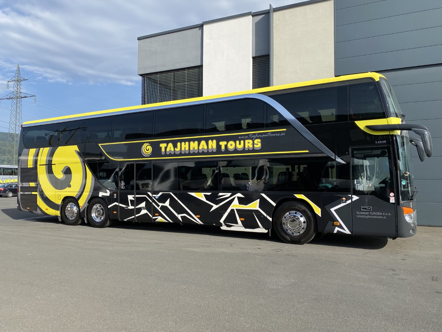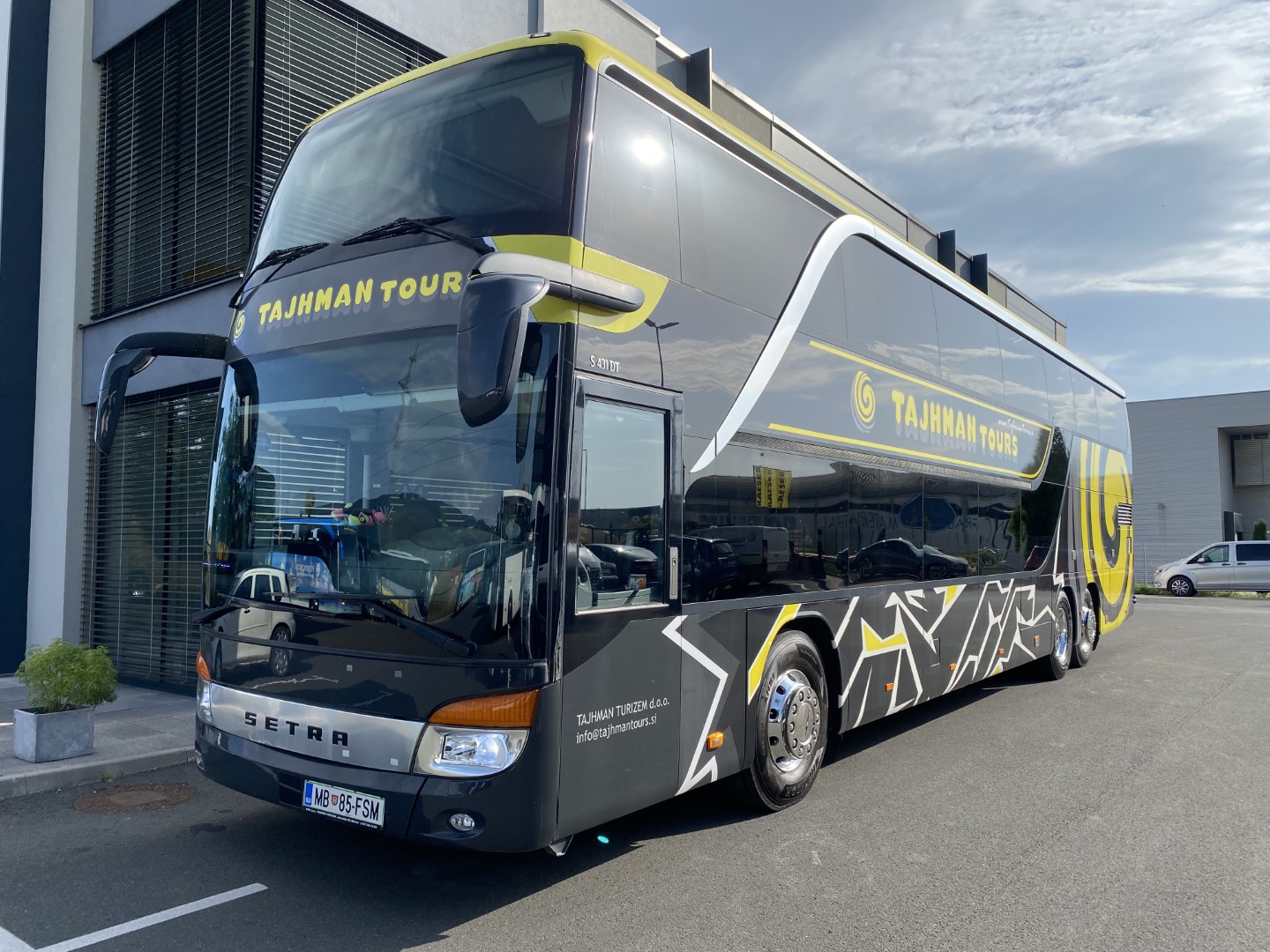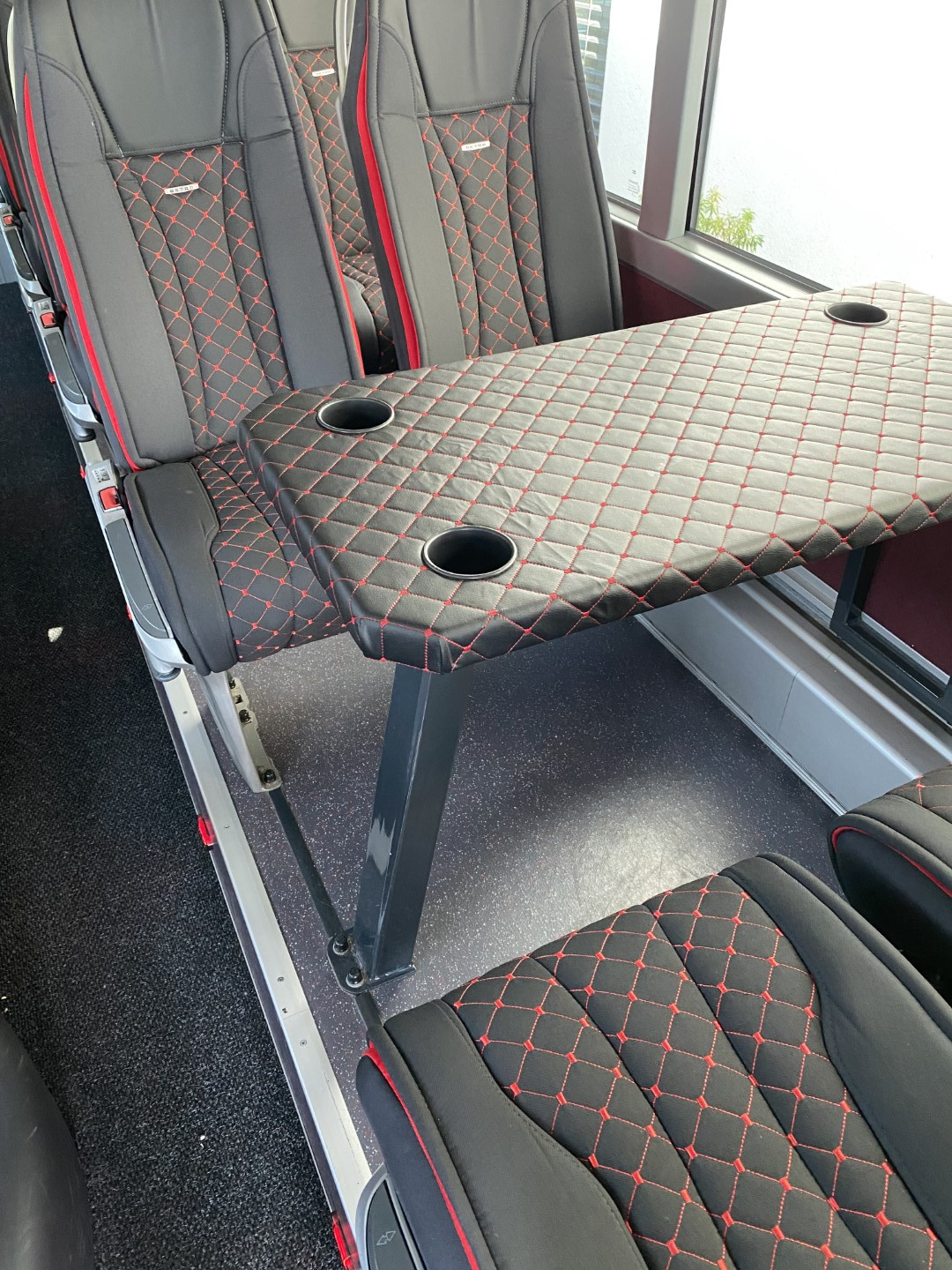 Udobni potniški sedeži Setra z varnostnim pasom z dvemi točkami, naslon za glavo iz usnja, obroba sedeža iz usnja, mrežice za časopis na potniških sedežih, preklopne mizice na potniških sedežih, dvojna zasteklitev stranskih stekel, dodatno zatemnjena stranska stekla, hladilnik zadaj (uporaba po dogovoru z voznikom), USB avdio sistem, aktivna podpora varnosti.