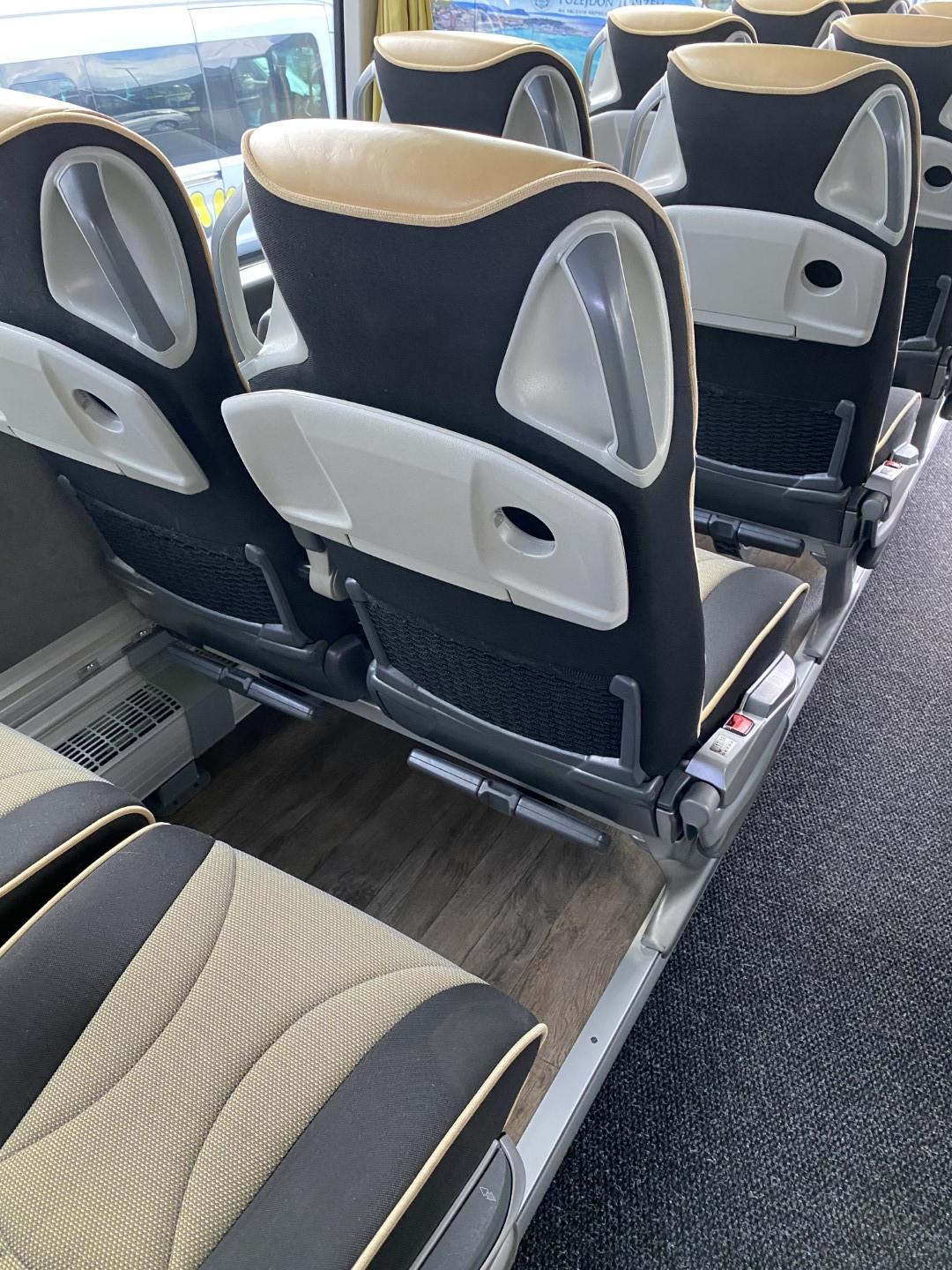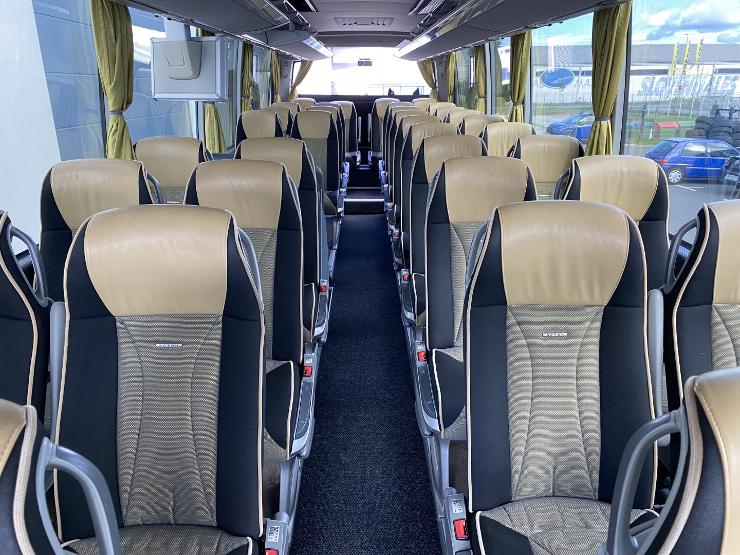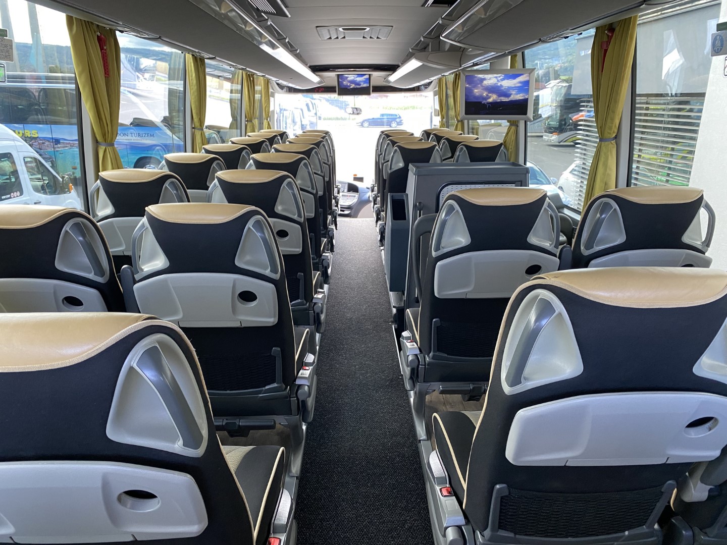 Udobni potniški sedeži z varnostnim pasom z dvemi točkami, naslon za glavo iz usnja, mrežice za časopis na potniških sedežih, preklopne mizice na potniških sedežih, dvojna zasteklitev stranskih stekel, dodatno zatemnjena stranska stekla, hladilnik spredaj, video sistem – DVD z avdio USB vhodom, 2x LCD, aktivna podpora varnosti. Toalet pri zadnjih vratih…