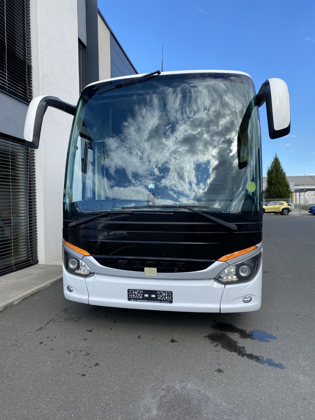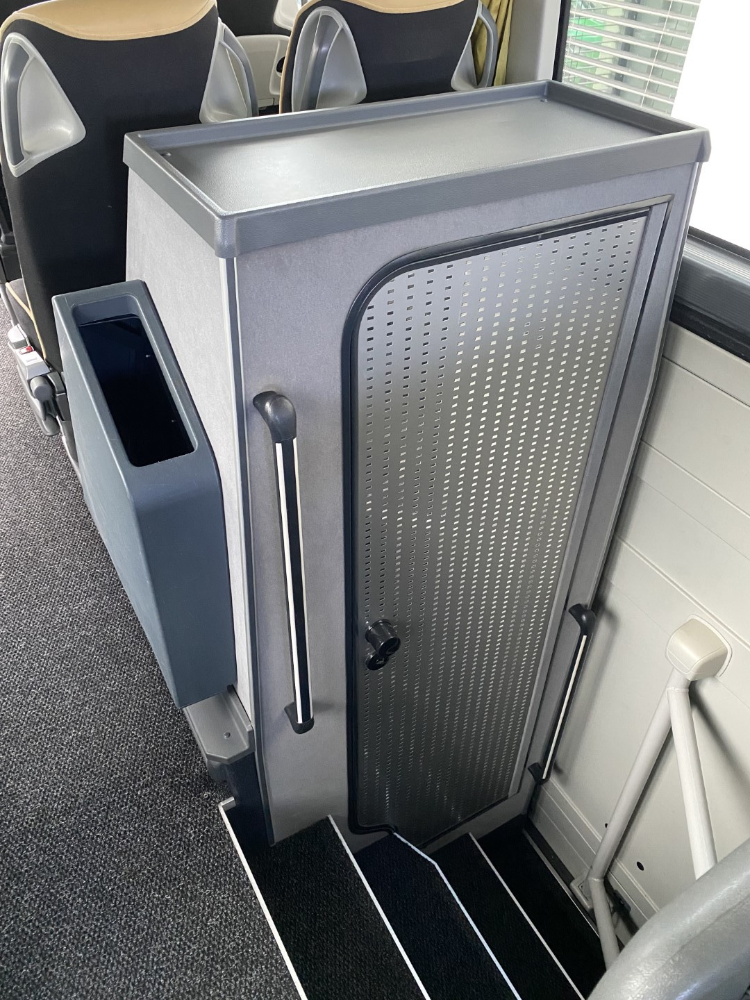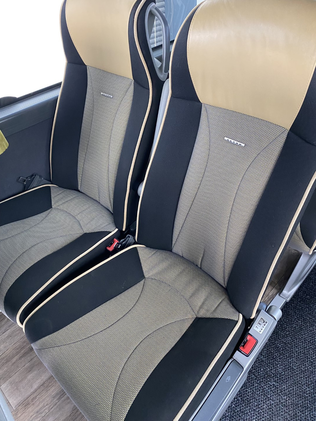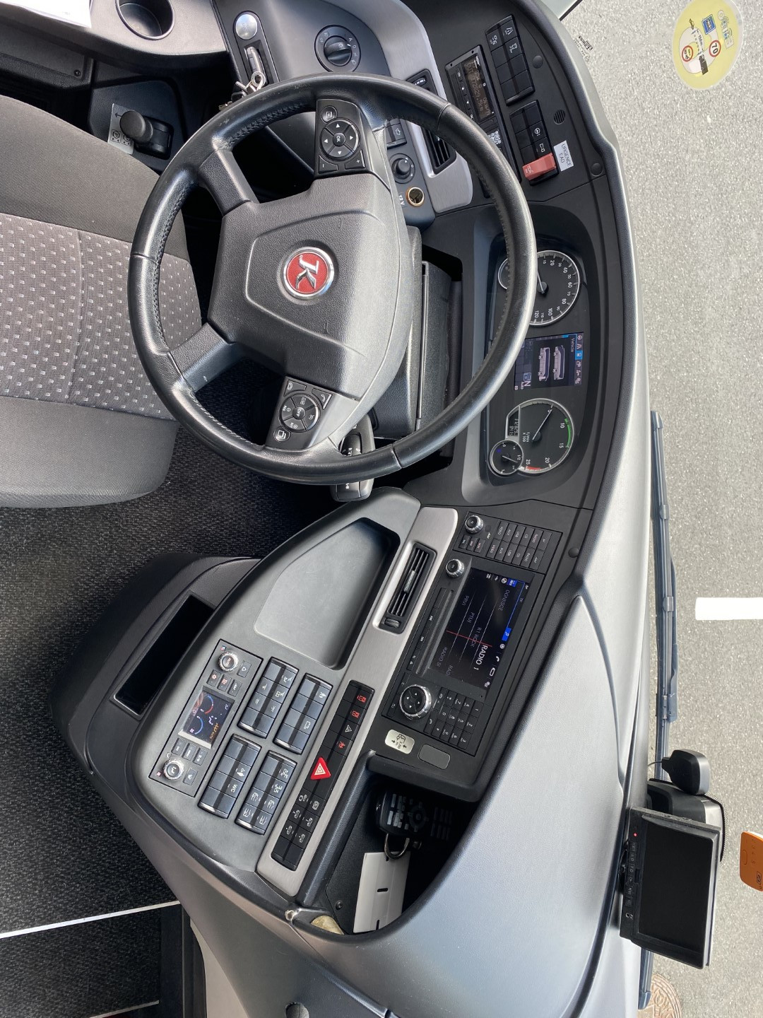 Udobni potniški sedeži z varnostnim pasom z dvemi točkami, naslon za glavo iz usnja, mrežice za časopis na potniških sedežih, preklopne mizice na potniških sedežih, dvojna zasteklitev stranskih stekel, dodatno zatemnjena stranska stekla, hladilnik spredaj, video sistem – DVD z avdio USB vhodom, 2x LCD, aktivna podpora varnosti. Toalet pri zadnjih vratih…